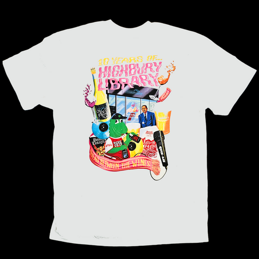 White Short Sleeve T-ShirtOnly 2 left!Celebrating 10 years of Highbury Library with some of favourite things! Design print by the brilliant Daryl Rainbow Short sleeve Gildan Hammer t-sh...